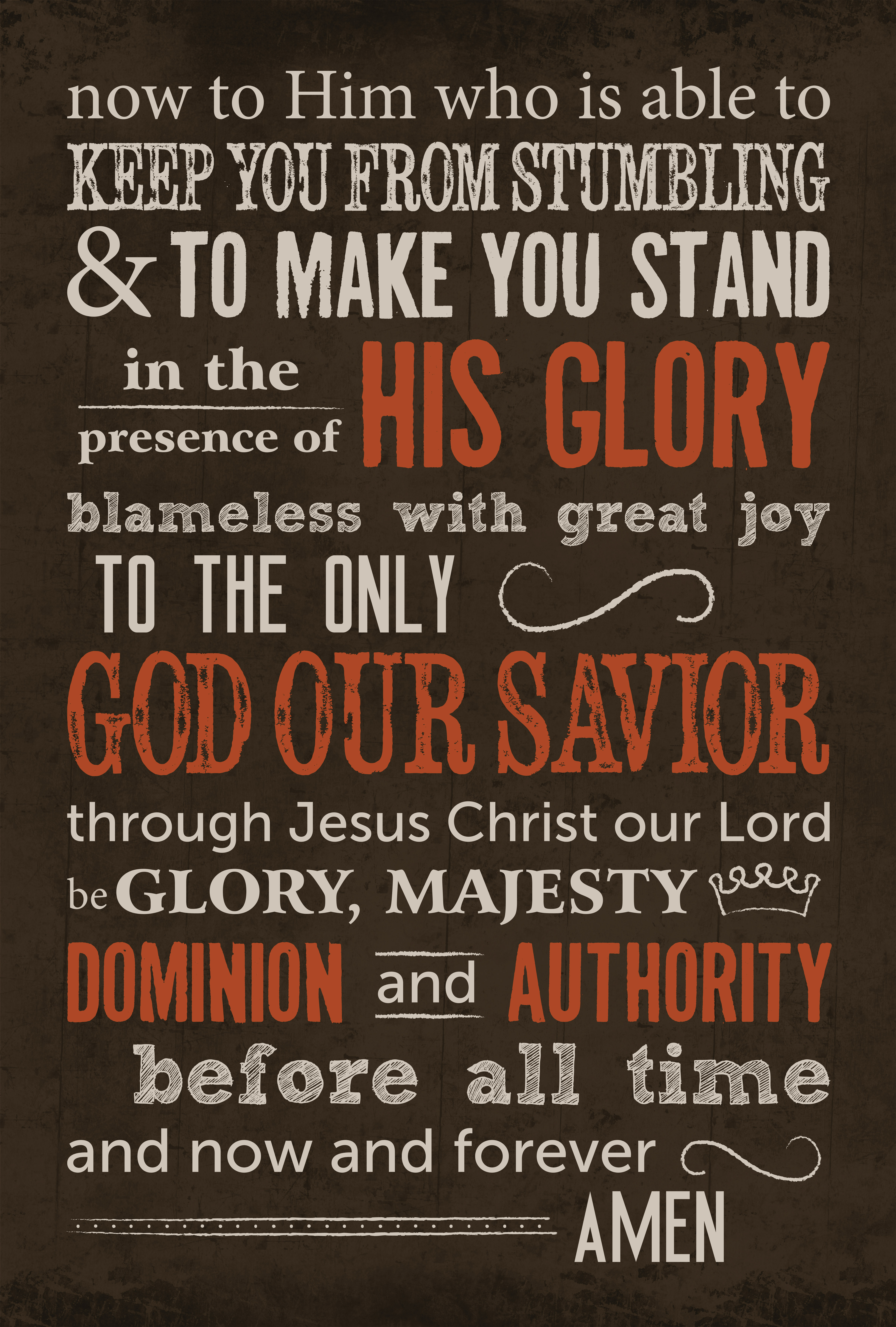 To him who is able to keep you from stumbling and to present you before his glorious presence without fault and with great joy—to the only God our Savior be glory, majesty, power and authority, through Jesus Christ our Lord, before all ages, now and forevermore! Amen. (Jude 24-25)