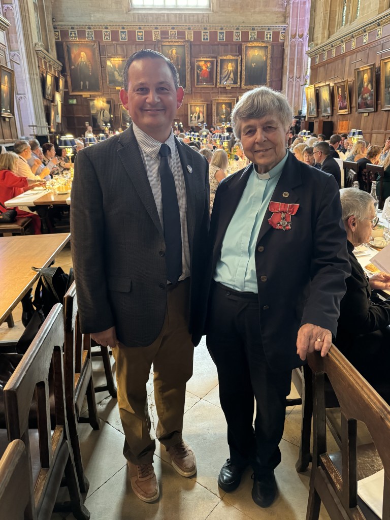 Rev. Dr. Liz Carmichael, MBE—the MBE ribbon/medal she is wearing was given to her by Queen Elizabeth and (at the time) Prince Charles for her years of peace building work in South Africa in the 1990s during and after the Apartheid era.